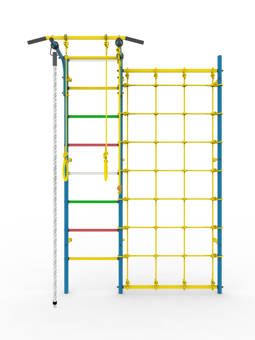 - Комплектация: турник (регулируемый по высоте), кольца гимнастические, канат, трапеция, сетка