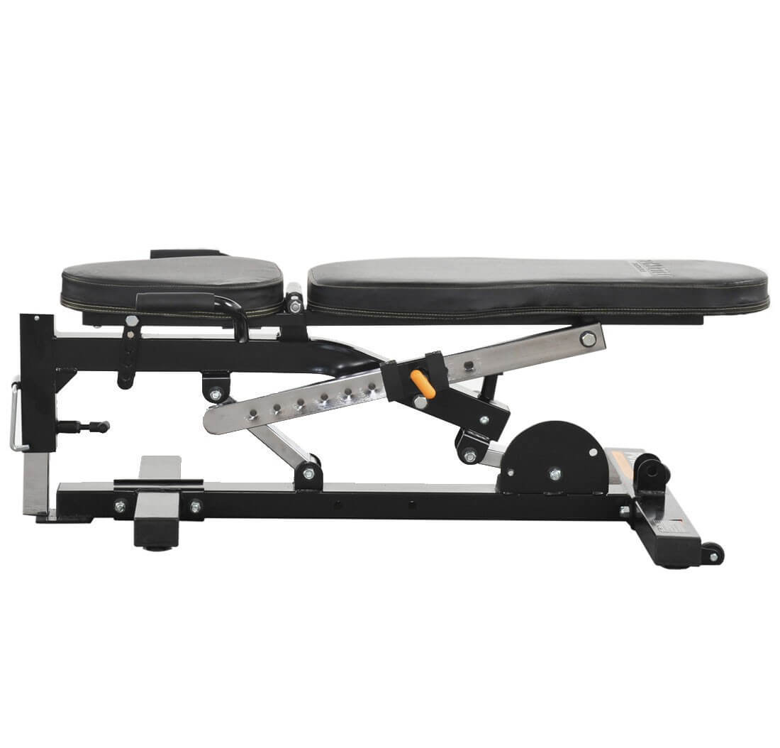 Множество настроек скамьи, в том числе и отрицательный угол наклона спинки.